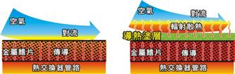 熱的傳播途徑共有三種形式,分別是「傳導」、「輻射」與「對流」。金屬分子排列緊密,通常會有很好的熱「傳導」特性,但熱「輻射」性能則不佳,因此,必須是較接近金屬表面的空氣分子才能獲得較好的熱交換。
