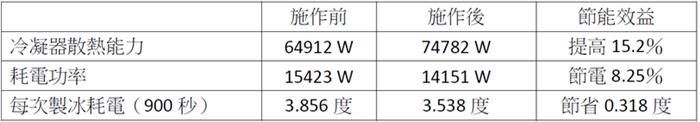 製冰機運作過程,當冷凝器散熱能力提高,即減輕壓縮機負擔,同時加強壓縮機機體散熱,依耗電功率記錄換算,達 8.25%節電率。製冰能力提高多少則不在此次量測範圍。